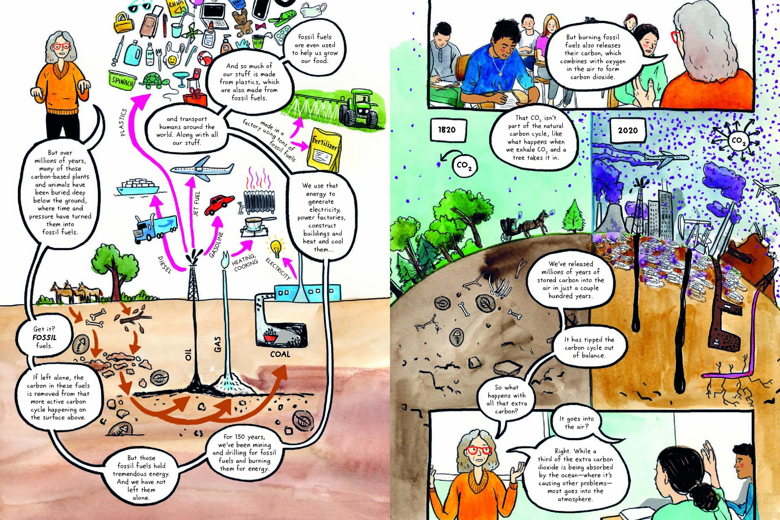 Novgorodoff’s watercolours seamlessly blend her fine art and cartooning sensibilities, and she peppers the book with vibrant landscapes like the Kentucky hills of her childhood. They serve as beautiful reminders of what these young activists are fighting to protect. On the text-heavy pages explaining the science behind the climate crisis, Novgorodoff understands the accompanying art must be simple yet visually striking. Her page layouts have an infographic quality, like the sample art depicting fossil fuel extraction. The content of the speech bubbles typify Subramanian’s excellent scientific communication, but the cutaway art that shows buried fossil fuels being extracted to produce everything from fertilizer to plastics neatly reveals how the climate crisis pervades our daily life. One of the few missteps in this book geared towards secondary school age children is a colour-coded timeline of climate events that spans six pages. The blocks of text stretch on for entirely too long and belabor the point that the climate crisis is manmade. A younger reader might find this section as engaging as their oft neglected textbooks.