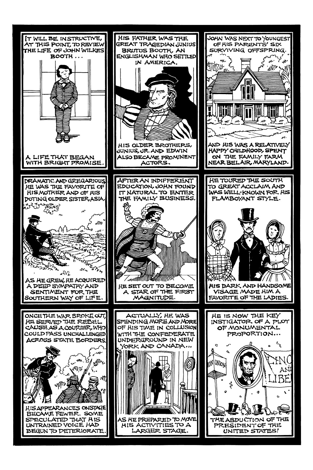 To find the assassination of Abraham Lincoln included in Rick Geary’s Treasury of Victorian Murder series is somewhat surprising. Since beginning with Jack the Ripper, Geary has otherwise tended to steer clear of high profile incidents, and yet this is probably the most famous 19th century killing in American history. What can Geary provide that hasn’t been on the menu for countless previous historians, investigators and commentators? Perhaps little, but what he will do is add considerably to events as perceived by most members of the public.