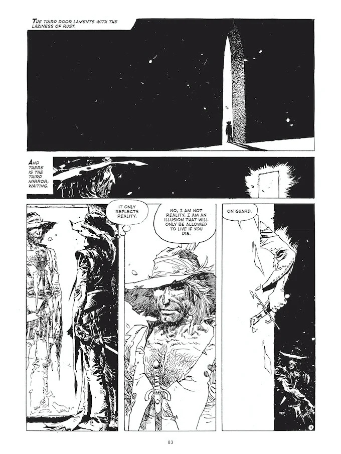 The title chapter is a clearing of the decks and a re-setting of the feature. Although Lucia was influential toward the end of the first volume, until ‘The Ominous Wind’ her only significant purpose here is to be kidnapped, although in absentia she acts as a conscience for Mayor. Trillo takes the opportunity to refresh the series, but avoids predictability in doing so as both Lucia and Raven depart. Because they’ve been barely used in these stories their departure in practice makes little difference other than a statement on Trillo’s part that Mayor works best as a loner encountering new people every episode. That’s how he continues in The Three Deaths of Alvar Mayor.