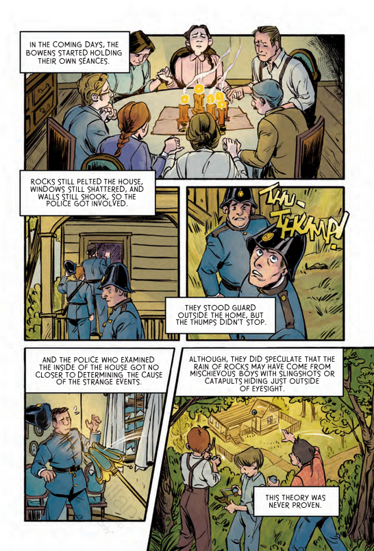 Perhaps not all parents will want their younger children introduced to the concepts of seances, poltergeists and spiritualism, but those of a less nervous disposition will appreciate the clarity and objective view Steve Foxe and Naomi Franquiz supply. As the book title tells us, there is no definitive answer in either case. Some people like the idea of events beyond humanity’s current ability to explain, while others find it a slightly scary proposition. Others still make it their life’s work to provide a conventional explanation for strange occurrences. Foxe just has Theo tell the events as they’ve been reported.