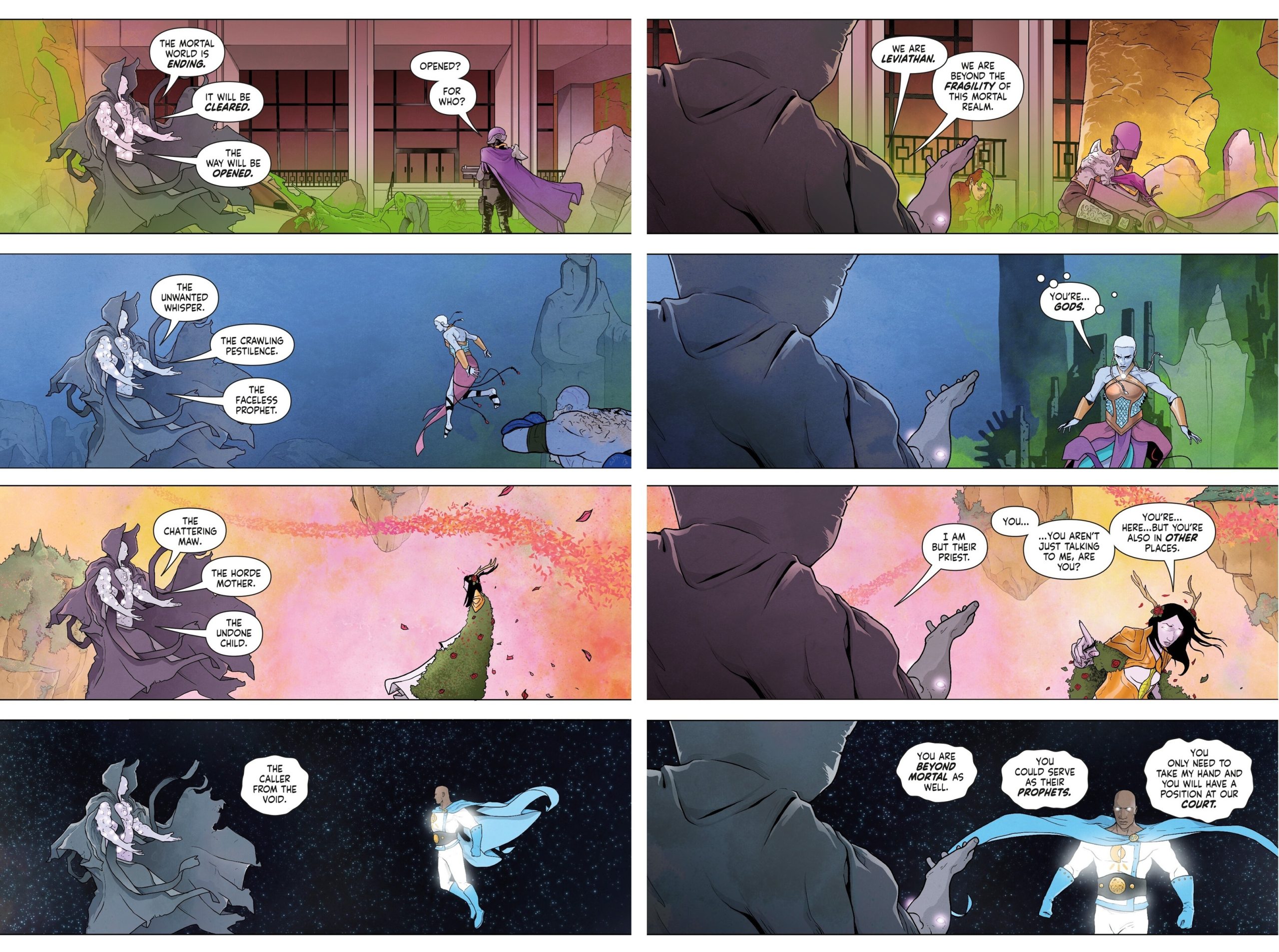 Luckert adapts classic superhero iconography to best suit each character, but tends to overdesign their costumes. Commander Comet has the cleanest design, with an asymmetrical tunic jacket and cape reminiscent of Captain Marvel’s first appearance. His luminous blue and white colour scheme is a welcomed contrast to the darkness of outer space and the putrescent palette of the Leviathan throughout. Both iterations of Devil-X have a recognisable aesthetic, immediately establishing them as the Batman substitute. While the devil horn pattern on their cowl is a nice touch, the abundance of pouches, padding, pockets, and ribbing evokes a maligned 1990s costume trend.