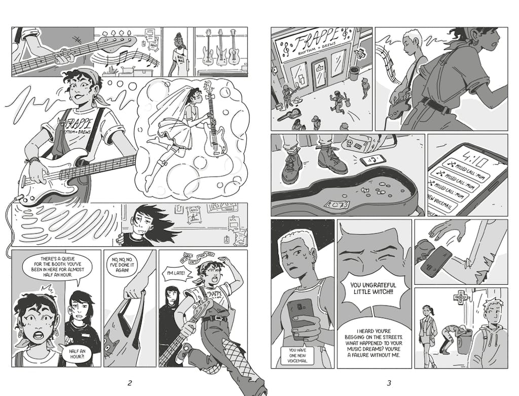 Artist Flo Woolley supplies expressive cartooning displaying the various personalities as they wear their hearts on their sleeves. However, the early pages when we’re getting to know the cast feature some clumsy segues. At one point Silvee rushes to the toilet. We see the door clearly marked, yet on the next page she’s passing Sassy and her friends. It requires close scrutiny to see the few tables sketched in the previous panel’s background. It leads to confusion at the start, but Woolley quickly becomes a more efficient storyteller. Conveying the excitement of a gig isn’t as easy in static form as might be assumed, and when the band play Woolley supplies the dynamism.