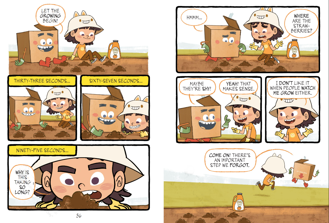 Bea and her best buddy Box love strawberries. They’d eat a billion of them, but unfortunately they’ve worked their way through a week’s supply in one spell of gorging. Bea’s mother negotiates a deal for more strawberries if they’ll eat ten lima beans, but Bea figures a better way might be to grow her own.