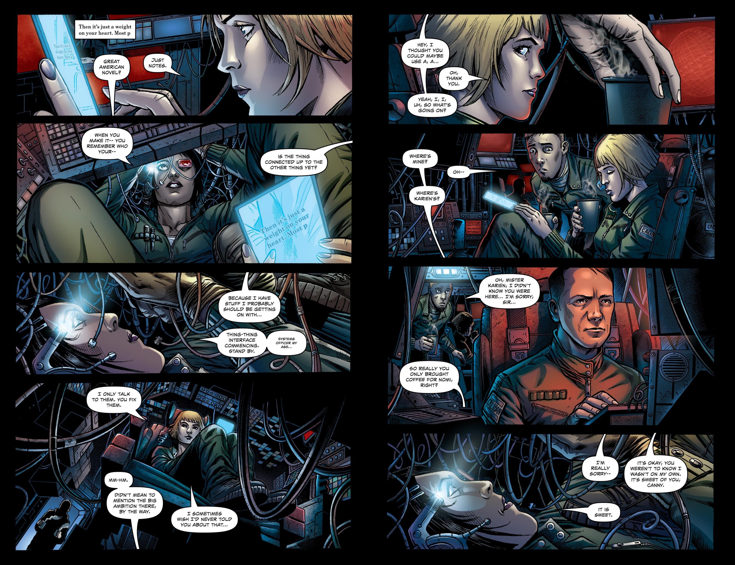 Facundo Percio’s artwork is incredible. He knows how to place characters within environments, and the relatively cramped and industrial human ship contrasts nicely with the more exotic alien vessel. He’s good at keeping characters on-model while still allowing them to express a broad range of emotions. The level of consistency Percio is capable of is vital for the variety of grounded sci-fi horror that Caliban is supposed to be, and he delivers.