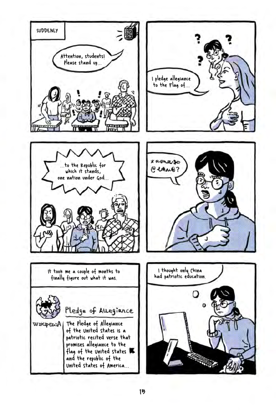 Seeing your own country through the eyes of newcomers is a way of considering how what’s taken for granted through familiarity can seem extremely unusual to others, as per the daily recital of the Pledge of Allegiance in schools (sample art). In common with many other newcomers to the USA Emma also notes how selective Hollywood is in their portrayals of ‘reality’, and that there’s no respect for the professions of immigrants. Her father was a college professor in China, yet works as a New York tour guide, and her mother in a nursing home having been an office clerk, and that brings its own pressures, ones that Emma only understands in hindsight.