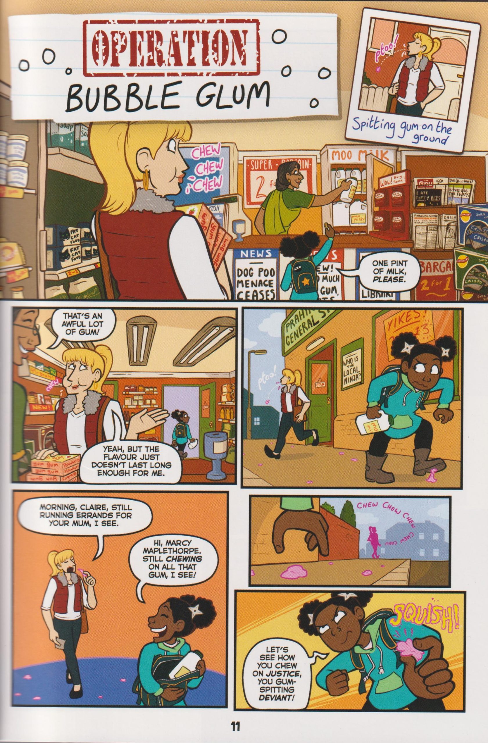 As creative as Claire’s solutions are, there is the moral ambivalence of her being unconcerned about committing greater offences in pursuit of avenging smaller, such as breaking into houses to retrieve stolen library books. However, on the better strips Brady conceives more ingenious solutions. The sample art shows the nice design of each malefactor identified by a faux polaroid picture detailing their offence, in this case the person littering the pavements with their discarded bubble gum. Claire plots their route and ensures they’ll often be stepping in gum, and Brady even sabotages that inventively.