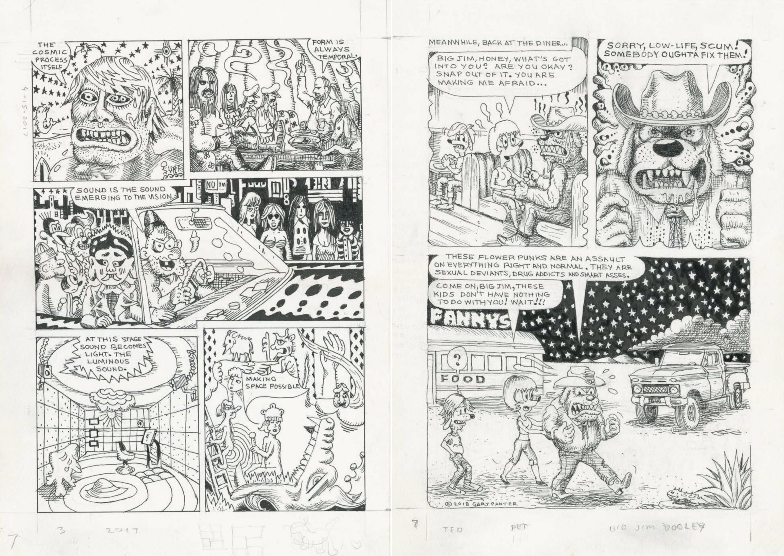 Crashpad is a love-letter to underground comix, and a septegenarian artist’s hymn to his youth. After some suitably psychedelic endpapers, Panter drops us straight into ‘Batlatis’ – the title evoking mythic lost utopia Atlantis, and ‘batty’ punk irreverence. This section (pictured, left) is a meditation on matters psychedelic, in the literal sense of “attempting to depict the inner world”. Non sequitur images depict tripping hippies, fairy tale figures, gurus, ‘funny’ (and not so funny) animals, and alchemical entities, all in imagined realms of mushrooms, mandalas, and Paisley pattern. Homages to underground comix styles and imagery, bolster this multi-dimensional depiction of psychedelia. Panter’s art installation mentioned in the publishers’ blurb, may be the source of this section.