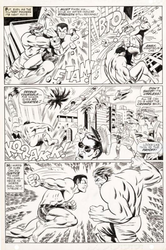 For all the artistic consistency, though, there’s little to recommend the stories. Standing head and shoulders above the remainder is Lee reworking The Island of Doctor Moreau, replacing Moreau with the High Evolutionary, a geneticist obsessed with the creation of humanoid animals. There’s hubris, pathos and tragedy as the despite his best intentions the High Evolutionary discovers his creations have reverted to feral instincts. Beyond that, two battles between the Hulk and the Sub-Mariner hit the mark, the second better for having them face each other on equal terms and showing the sheer power the two of them generate.