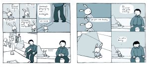 Fluffy is the story of a little white baby bunny who thinks he is human. Fluffy is the responsibility of a young man called Michael Pulcino. We never find out exactly how this situation came about, but Fluffy has been living with Michael for some time and the slightly anxious man takes care of the little boy rabbit, in the manner of a parent or guardian. Of course Michael is not Fluffy’s dad, and he keeps trying to get Fluffy to understand this, but the little rabbit refuses to accept it. “Why do you keep saying that?” Fluffy asks him. “Because it’s true,” Michael tells him. “I’M NOT A BUNNY. YOU’RE A BAD DADDY FOR SAYING THAT” the little rabbit says, ending the difficult conversation by running away.