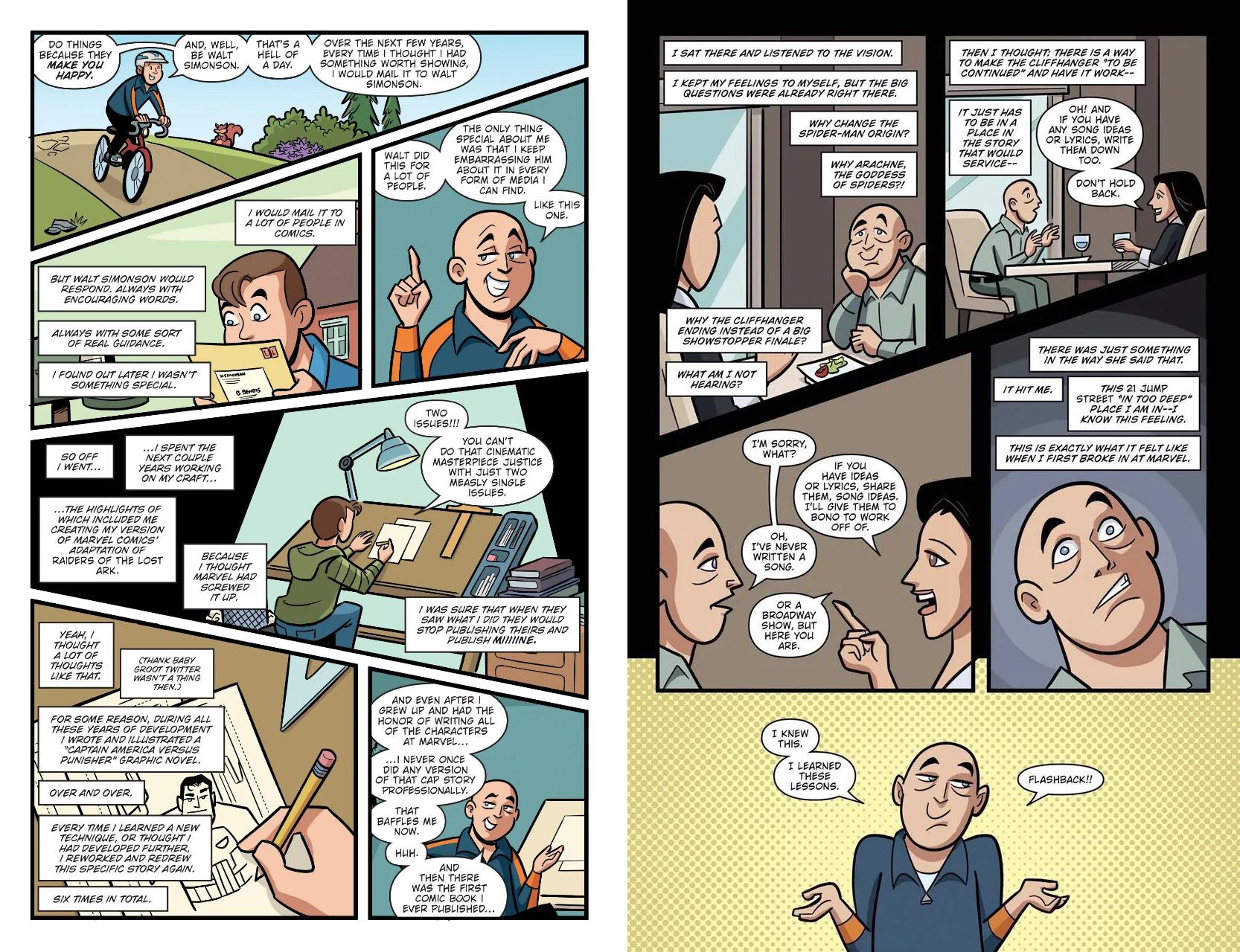 After the introductory tease, pages about the potential musical interrupt the personal reminiscences before hovering back into focus for the final stretch. It’s a good anecdote, one worth telling for both the humorous effect and the life lesson, but it’s not enough to hang an entire book on. If you really really loved the first Fortune & Glory perhaps this will scratch an itch, but otherwise your interest is going to have to be in Bendis personally, not stage musicals of Spider-Man or the background of theatre productions.