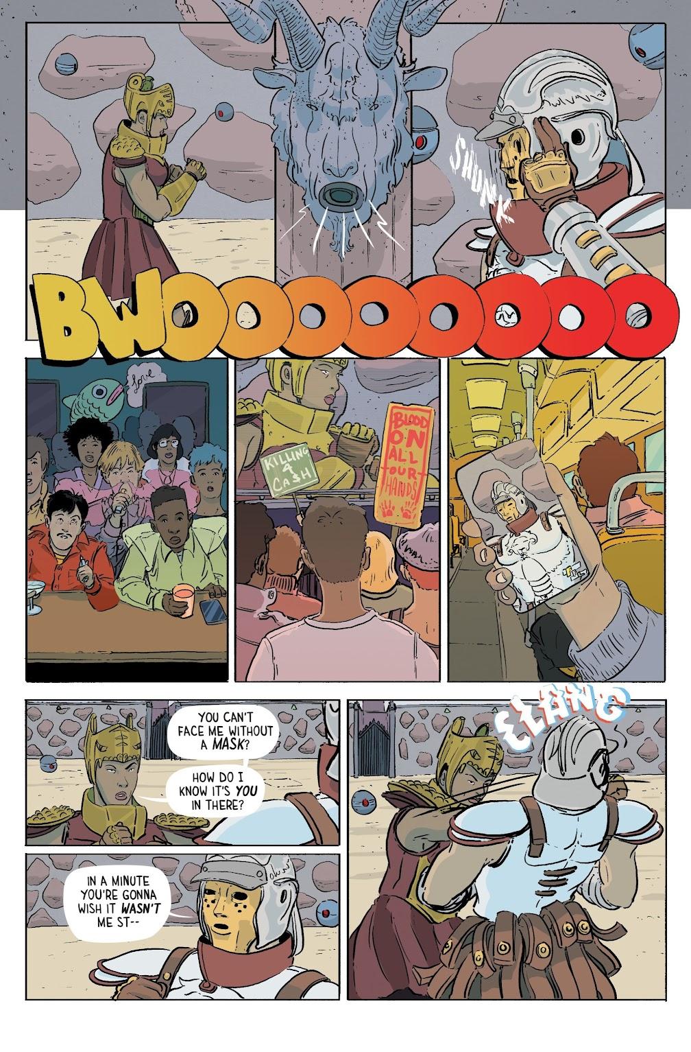In Free For All Patrick Horvath envisages a future in which those among the exceptionally wealthy are selected by lottery to donate half their wealth to the government to pay for essential services. If they don’t pay by a deadline they’re hauled into court, which is where we meet pharmaceutical magnate Cameron Miller, who’s judged to have avoided payment. “They’re gonna have to come take their money if they want it” perhaps wasn’t the wisest public statement under the circumstances. The penalty is payment anyway, plus gladiatorial combat televised as if a sport, complete with hosts and commentary.