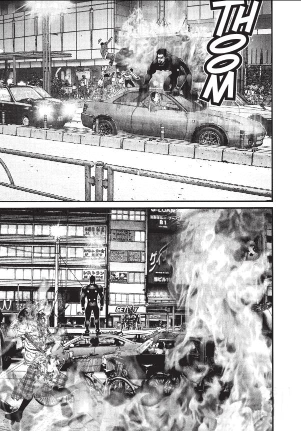 A wonder of Gantz is how Oku can keep escalating the thrills. What at first seems the greatest battle the series has delivered evolves into an even greater threat. When Oku’s used that device in the past it’s often seemed as if the story’s being artificially prolonged, but not in this case. There’s also an element of mystery sustained by observers briefly discussing what’s going on, then departing when they consider the outcome a forgone conclusion.