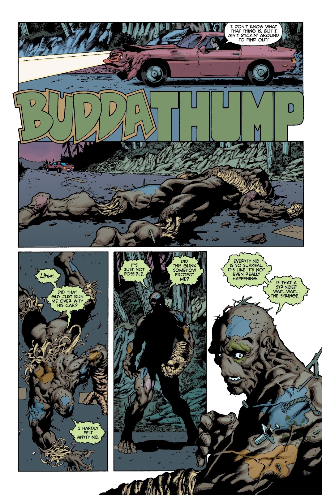 Aaron Lopresti tells his story in eight page chapters, and they’re immaculately drawn, atmospheric, dynamic and dripping technique whether spotlighting Morse’s previous life as a ordinary person or his troubled new form and the horrors he encounters. Lopresti has always been a very good and under-rated artist, and Garbage Man might be a career peak. Each chapter has Morse learning a little more about what he’s become and remembering a little more about who he was while encountering much strangeness in the backwoods.