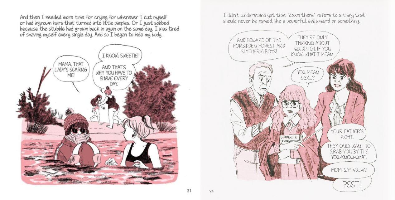 Klengel, though, is using humour as a weapon, pointing out how suppressing discussion of women’s body parts, and in worst cases demonising them – thank you, Sigmund Freud – continues to repress women as a whole. Her comparisons are so well conceived, reaching a peak with a series of cartoons about the vulva being compared to Harry Potter because it should never be named or discussed. One subject leads naturally to another, culminating in Klengel using her childhood dolls as models to illustrate the disturbing games she played when younger, although distressingly for a European graphic novel Lego is referred to as “Legos”.