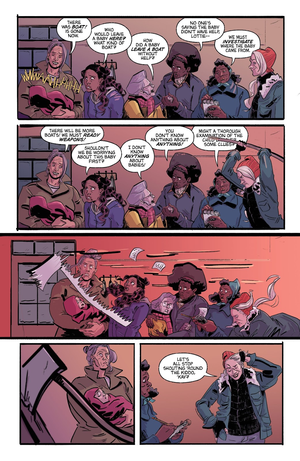 Williams once again has a different narrator for every chapter, and because we now know who people are she’s able to slip nasty true intentions into the narrative captions. These are accompanied by some brilliant expressions from Lauren Knight, especially when it comes to the ball of bile known as the Witch in the third chapter. Once again Knight in combination with colourist Sofie Dodgson produces spartan landscapes that nonetheless impress, but it’s the visual characterisation of the cast that sticks in the mind. They’re assorted and of different temperaments, but all memorable.