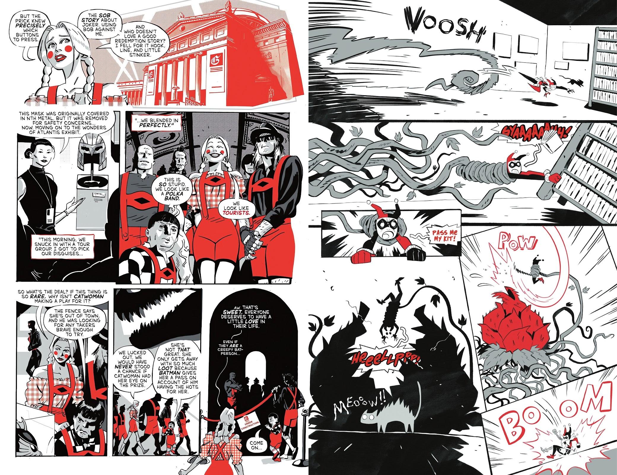 Because you’ve read Harley Quinn: Black + White + Red you know the drill by now. In Black + White + Redder another eighteen creative teams supply a one-off Harley story looking at any point of her past or present or future. Their contributions are in black and white with red the only colour. Now, usually the sequel is the second banana, and although the names of the creators might not be as familiar here, this selection actually improves on the first, which is a real surprise.