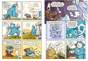 Wake the Ice Man is the second in Luke Pearson’s new series of books about his child hero Hilda, who lives in a small cottage in the middle of the Scandinavian countryside with her mother. As seen in Hide from the Rain, Hilda’s pet Twig is a very unusual creature, a ‘deerfox’: a doglike creature with a large tail like a fox, and tiny antlers on his head. Together, Hilda and Twig have encountered a range of mythical beings and animals over the six books of Hilda’s adventures in large-format albums.