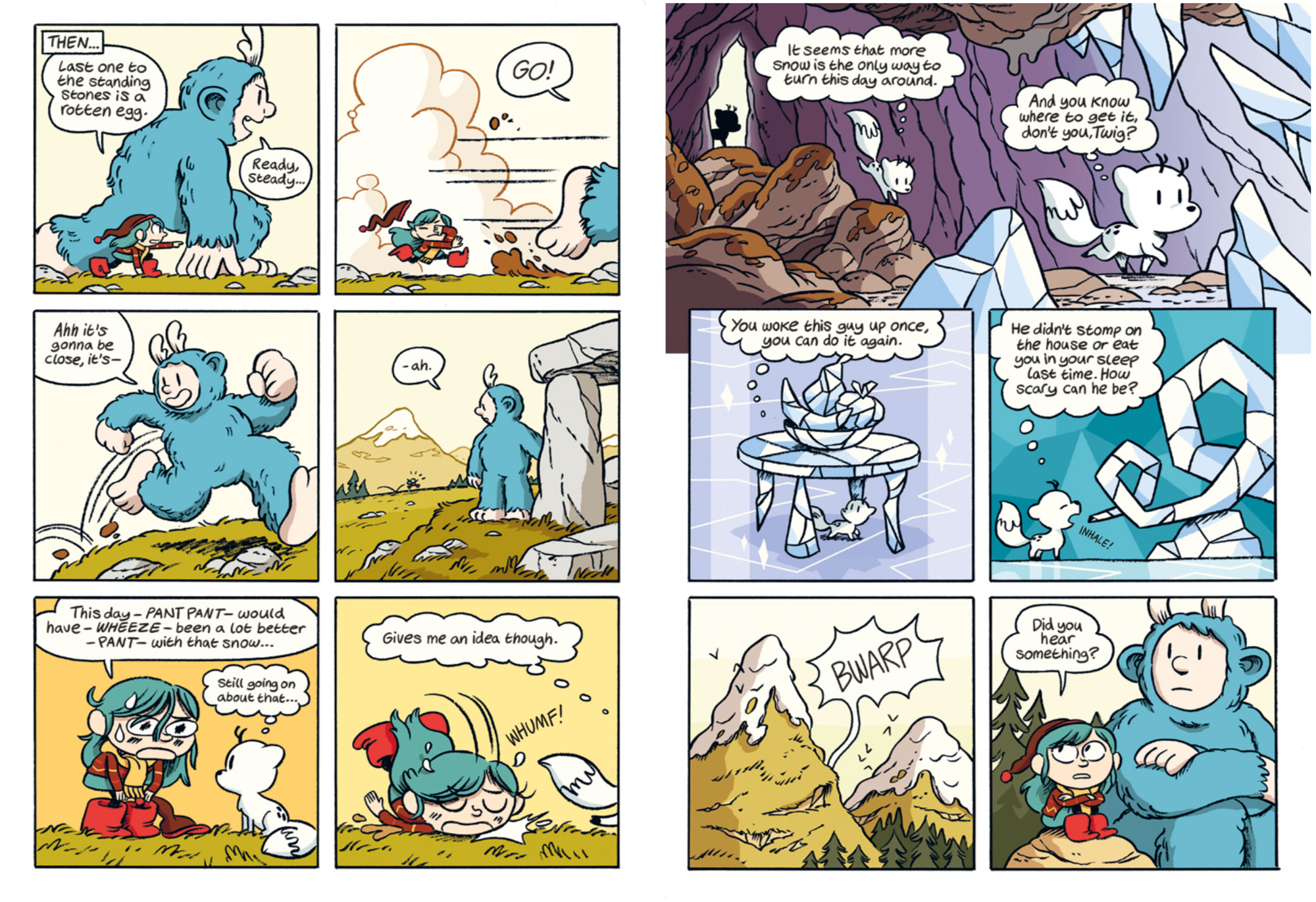 This book opens with Hilda trying to hide from a scary silhouetted giant. “Okay Hilda…” She thinks to herself, a single drop of nervous sweat running down her forehead, “Just keep quiet and she won’t see you…” It’s actually a game of hide and seek she’s playing with her new friend Burku the Giant. Burku is big, but she’s not as big as her enormously tall parents, who have felt a chill in the air. It makes Hilda impatient for the snow to arrive, and when Twig decides to try and help that happen, he wakes up the Ice Man, the spirit who brings an early winter. But when the snow starts piling up far beyond what anyone can handle, how can he get the Ice Man to go back to sleep again?