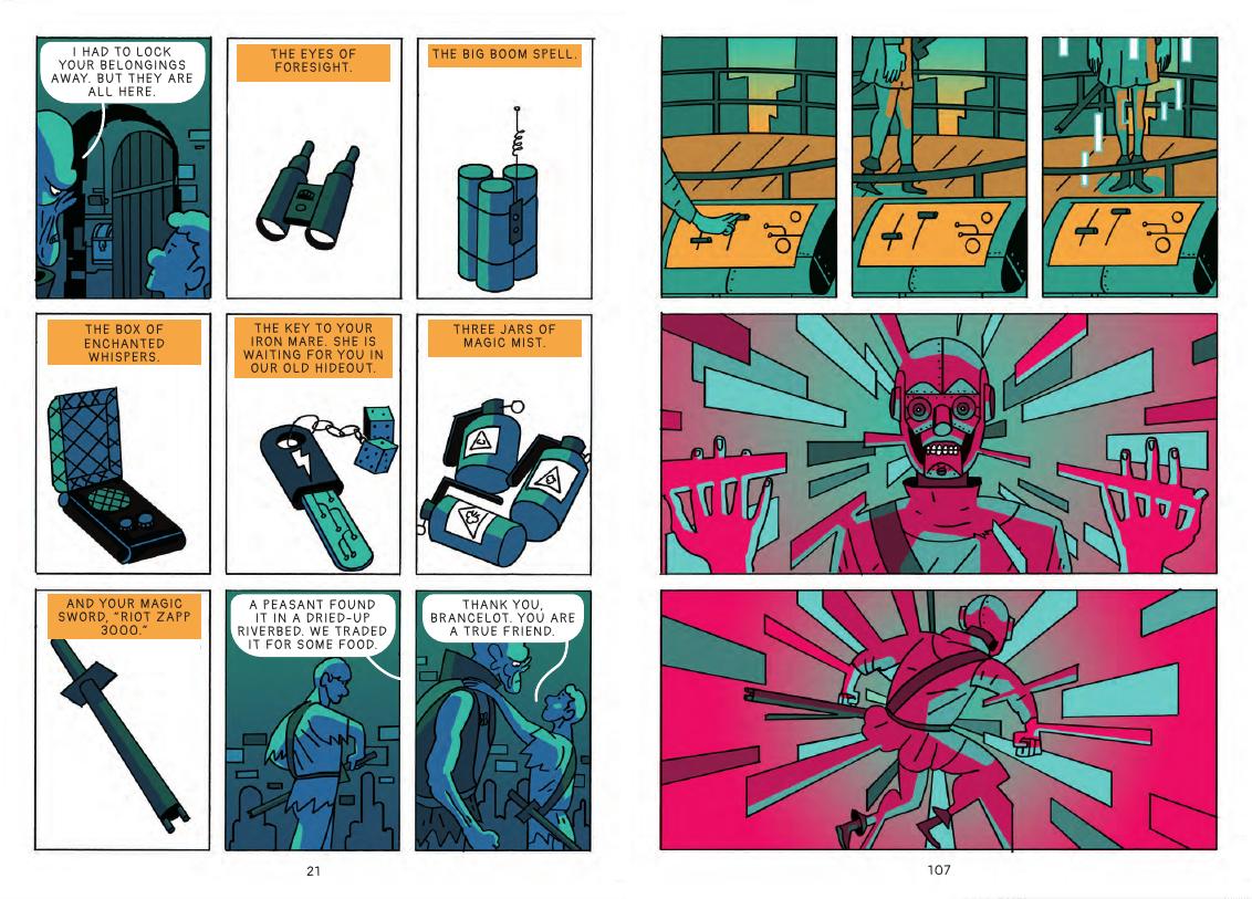 Ionheart opens with a man wandering through a desolate landscape. He’s captured and brought before a ruler who recognises him, but thought him dead for thirty years. It’s relatively standard fantasy until just over ten pages in when Lukas Kummer supplies the left sample page telling readers that all is not what it seems. Somehow there’s someone with technology familiar in our world, and they’re being chased by a remorseless robot. Kummer gradually reveals how that situation came to pass.