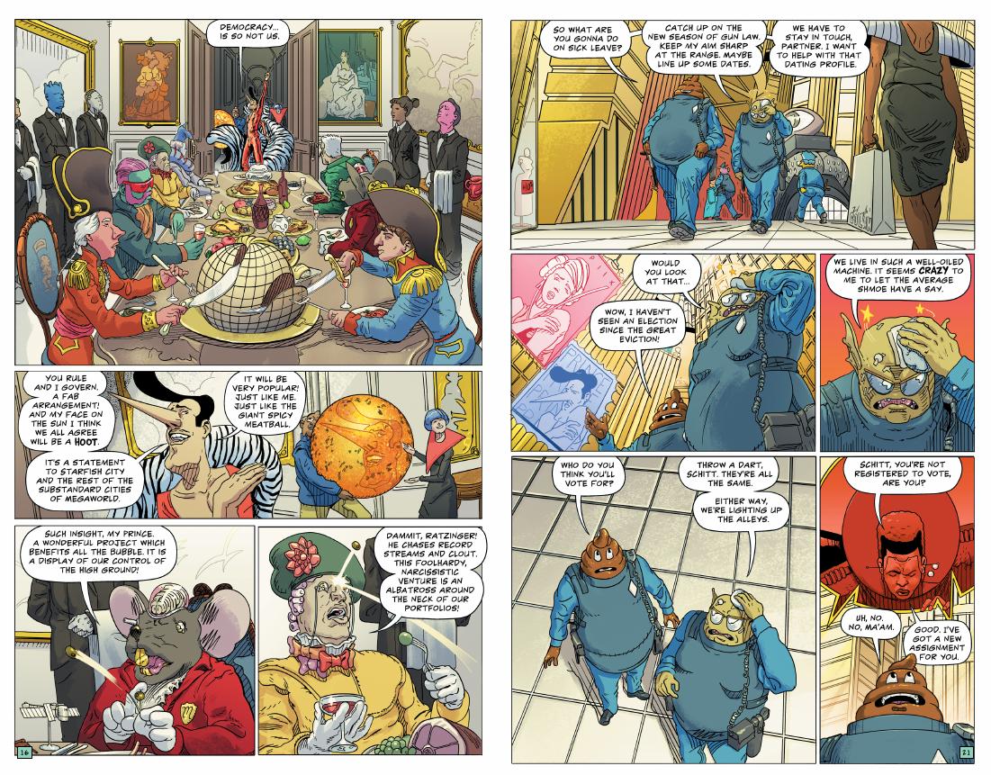 As if to prove what a crazy world it is in Bubble City, there’s going to be an election. Apparently it’s some ancient procedure similar to an online poll whereby the citizens can actually choose their mayor rather than accept he’s inherited the position. The mayor is outraged, but he’s soon on a campaign to pick up the best voters money can buy, while as seen on the sample art, officers Schitt and Swamp have differing ideas about the value of elections. As ever, though, Swamp has problems with his dating profile.