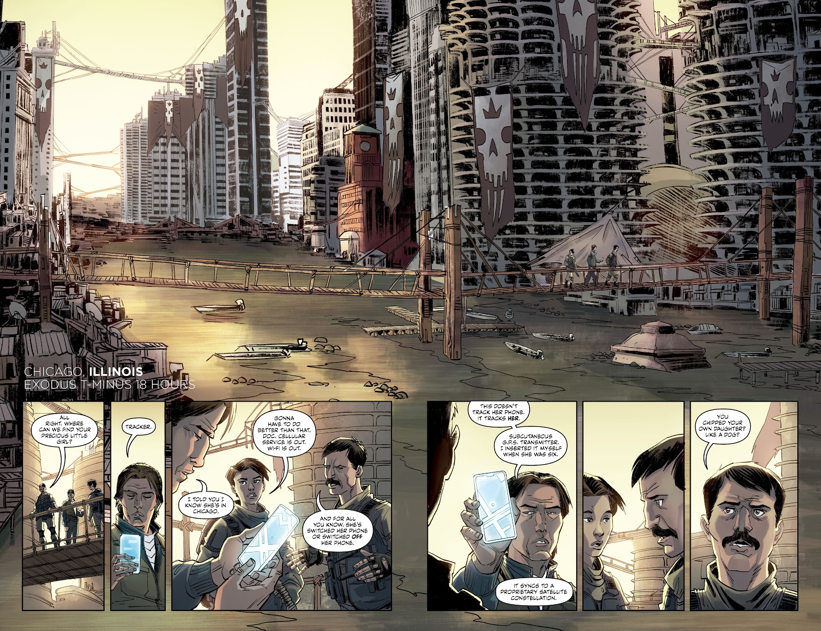 Last Flight Out picks up in 2031 by showing Dr Ben Caewood prioritising his work over being present when his daughter is born. He seems equally preoccupied when his wife dies and Sara survives a car crash. That doesn’t seem to have been lesson enough about what matters, though, and there’s little interaction with his daughter going forward. It’s a clever piece of writing from Marc Guggenheim, as after ten pages every reader will have made up their mind about Caewood. Only then is it revealed what Caewood’s been working on. It adds to the desperation of what develops.