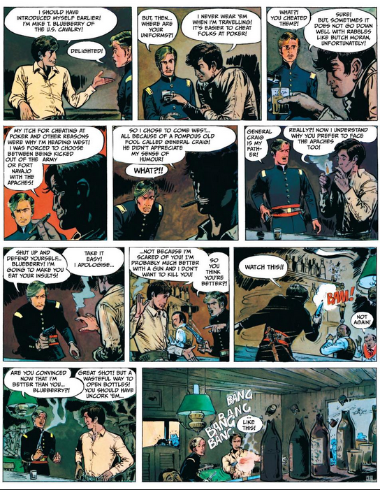 The translation’s by Anthea Bell and Derek Hockridge whose lively interpretations bring Asterix to life and who manage the same sparkle here. However, some language referring to Native Americans accurately represents historical prejudice, but would now be toned down. Charlier, though, doesn’t follow the usual pattern of Westerns, highlighting differences between different tribes and the bigotry of some American soldiers, which would also have marked Blueberry as different when originally produced.