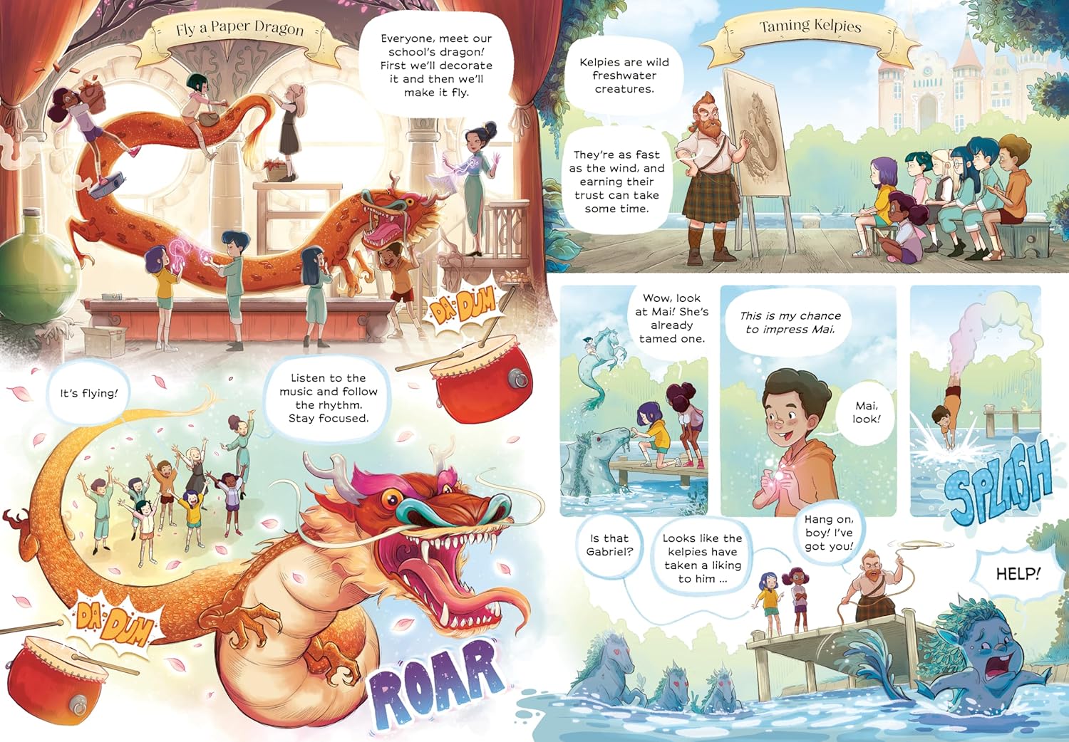 Additional information about the use of witchcraft and magical creatures, for this book a dragon, are given in spreads combining text and illustration. Only two books in it’s clear that Bonet places importance on categorisation. Individual witches slot into one of eight schools with different colour schemes for uniforms and with individually ranked powers. While Bonet’s skilled at drawing young children who look individual, their dialogue is pretty well transferable as they all have the same enthusiastic and upbeat personality.