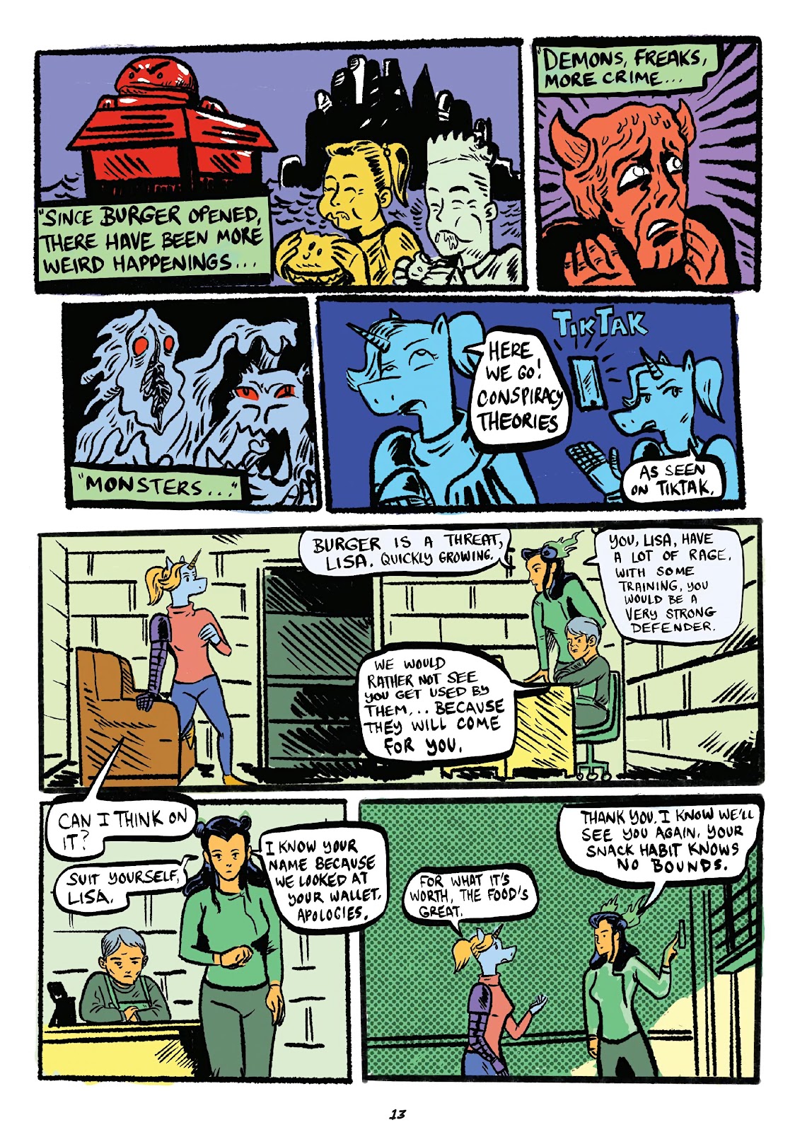 Lisa Cheese is a 320 year old unicorn with a bionic arm living in the futuristic Earth City. She’s only just bought her bun when she witnesses a couple of burger beings acting suspiciously, then set upon by a ninja. Lisa may look mild-mannered, but when provoked a couple of burger kids are no match for her manic form. It seems they represent corporate interests, and an awful lot of independent snack shops have been sabotaged via planted burgers with drugs among the ingredients.
