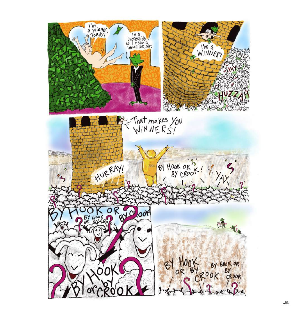 Little Bo Perp and Mary on the Lam is Marian Henley’s fractured fairy tale about the current state of the USA, and there’s no mistaking the anger that prompted the project. However, it’s both strength and weakness. It enables the almost visceral linework and righteous wrath, yet also seemingly blinds Henley to the strained nature of much of the book. Having come up with the idea of using the nursery rhyme cast some opportunities arise, sheep being fleeced for one, but other items are strained in fitting the pattern. They’re combined with jokes that are just too obvious, mainly concerning the vainglorious and self-obsessed Crooked Man, his infinite ego, and those feeding it, along with messages hammered home without subtlety.