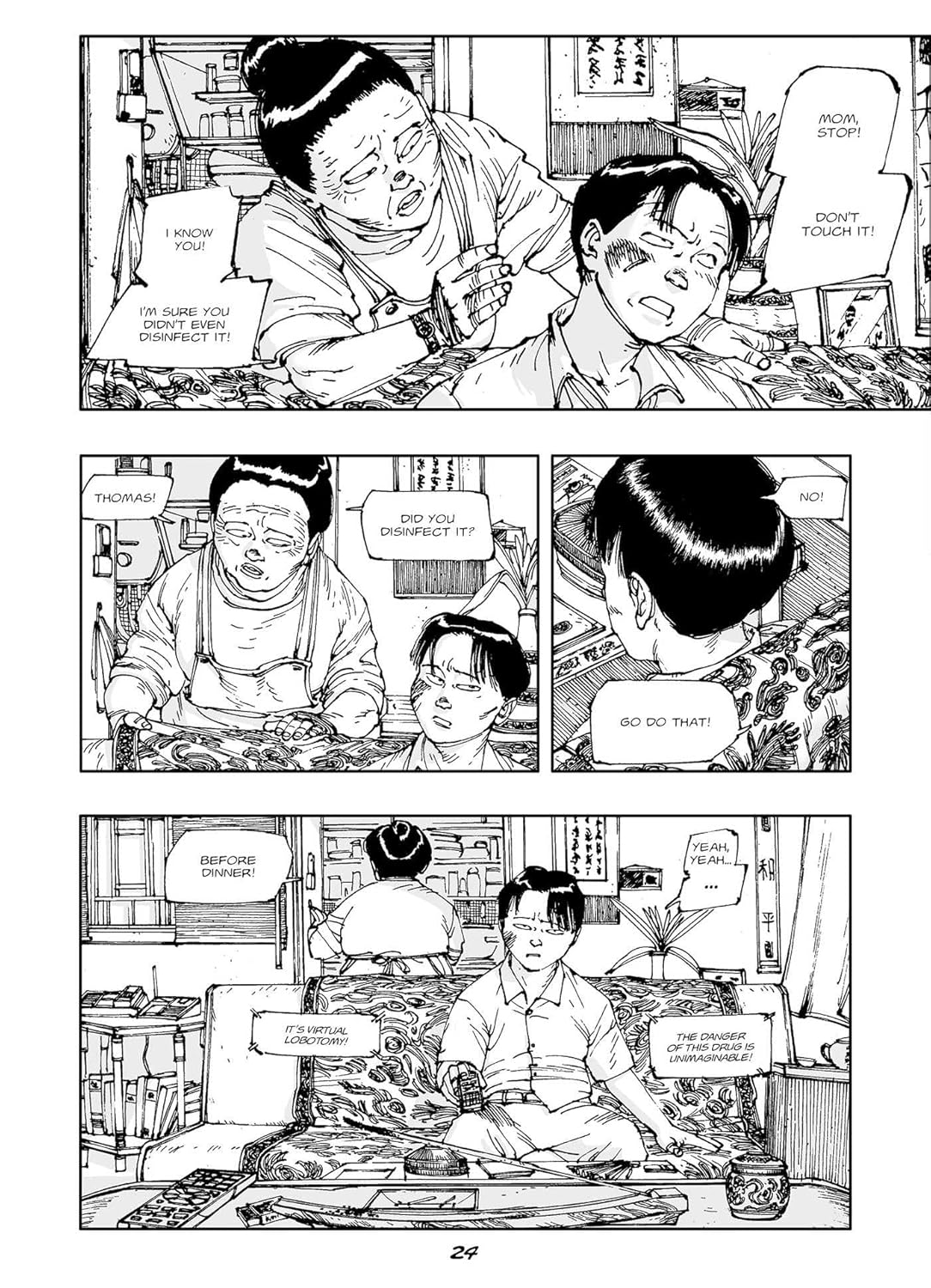 Miki Makasu spends a long time establishing just what a pitiful life Thomas leads, and it’s drawn in mind-numbing detail by Benoit Bourget. How much? Well, there’s detail and there’s Bourget. It’s there in the backgrounds of the sample art, but give Bourget part of a city to draw and he’ll supply every window frame and doorbell. Every rivet on machine is visible and even when there’s an opportunity to slacken off a little, the couch pattern on the sample page is still complicated. At times it’s just too much.