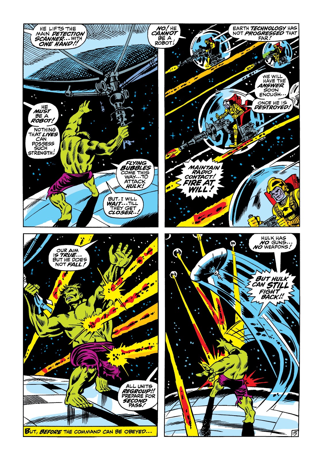 As with other series where he wound down his writing in the late 1960s, Lee’s later writing isn’t what he’d be remembered for. An indication of his time being occupied elsewhere is nearly all the soap opera being discarded for non-stop action, which is easier to write, and while there’s an energy rush, Lee leaps from one plot to the next with no great regard for anything other than filling the pages. The shock death of Bruce Banner ending Volume 4 is rapidly reversed by alien technology and we move from aliens wanting to subjugate the Earth to the discovery of them also in thrall to a ruler. Stories repeatedly end with Banner endangered when any reader can predict transforming to the Hulk will be the solution.