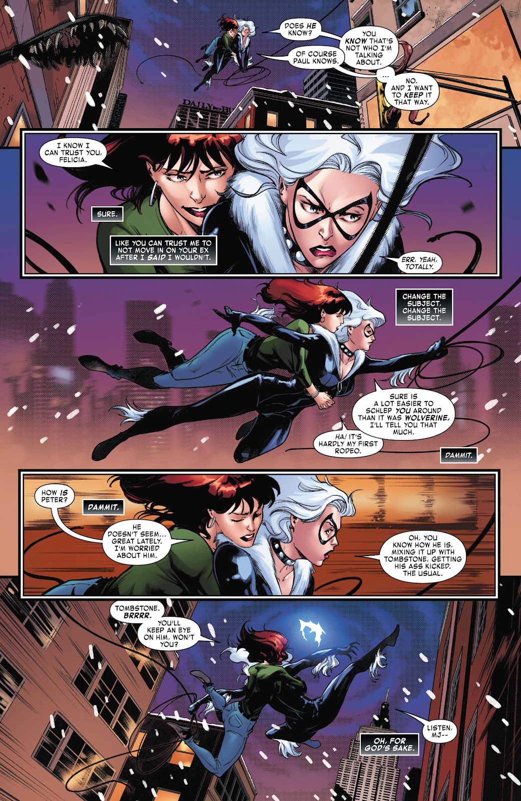 Mary Jane & Black Cat takes place during Dark Web, one of Zeb Wells’ less entertaining Spider-Man arcs, and after Mary Jane Watson acquired a device supplying her with random super powers. She’s been keeping this secret, but Black Cat sees her in action, sparking what follows.