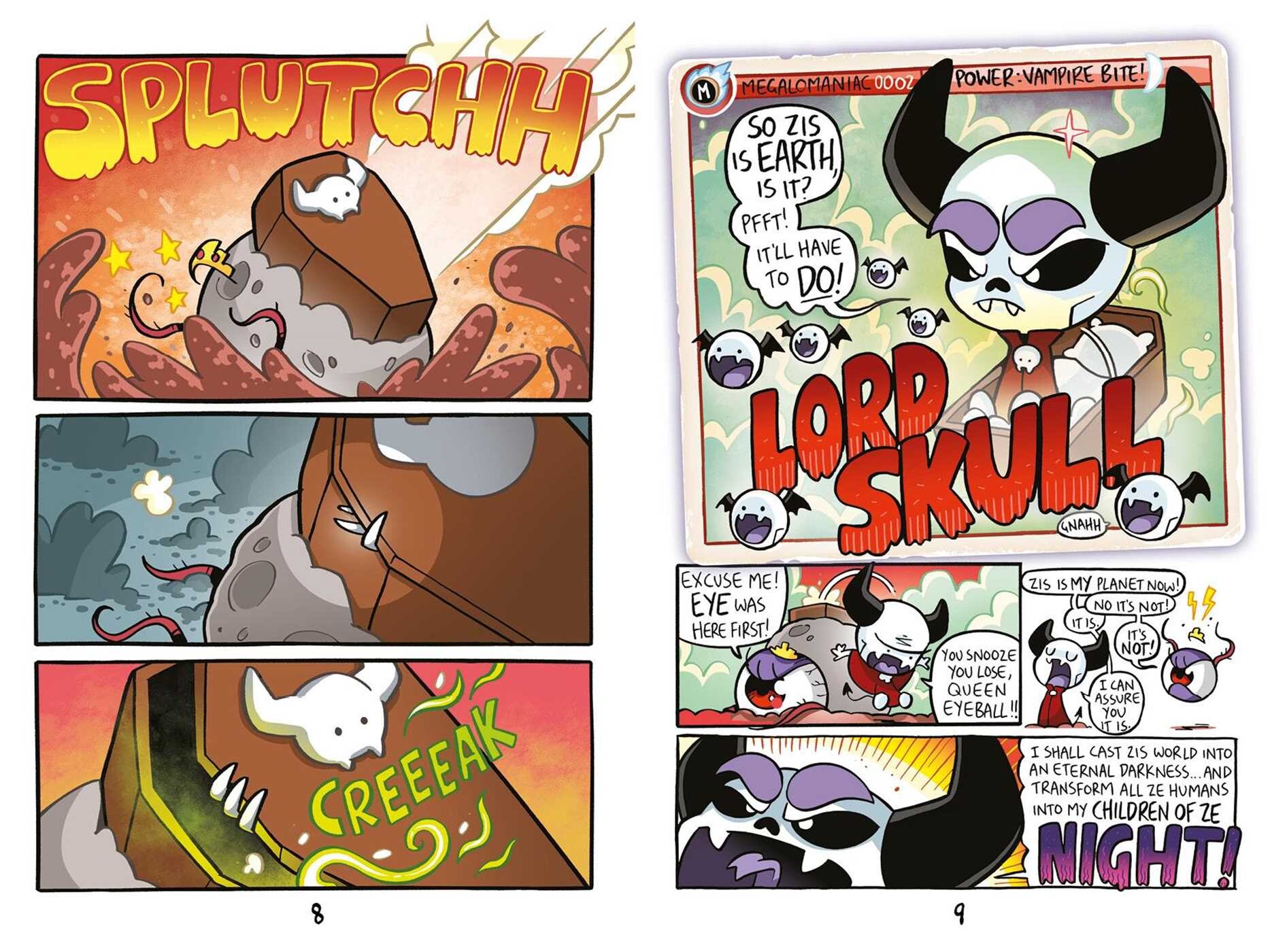 Each megalomanic is introduced via the equivalent of a trading card illustration, although the form more resembles a beermat than a card. Given Smart’s already established as the greatest creative mind UK children’s comics have seen in decades, the aliens are many and varied from a giant eyeball to a mechanical cat, via a talking fist (with an East Enders accent). Based on number of appearances alone, Smart’s favourite seems to be the vampiric Lord Skull, fond of spouting his own superiority in Eastern European accented dialogue. “You insolent hand! I am Lord Skull, ze future conqueror of Earth!” is a standard dialogue, in one case brilliantly followed with “Even though I am currently sitting in a river of *heurgh* human filth!!” Yes, the fart and poo jokes guaranteed to cause youthful sniggers are as essential here as in Bunny vs. Monkey.