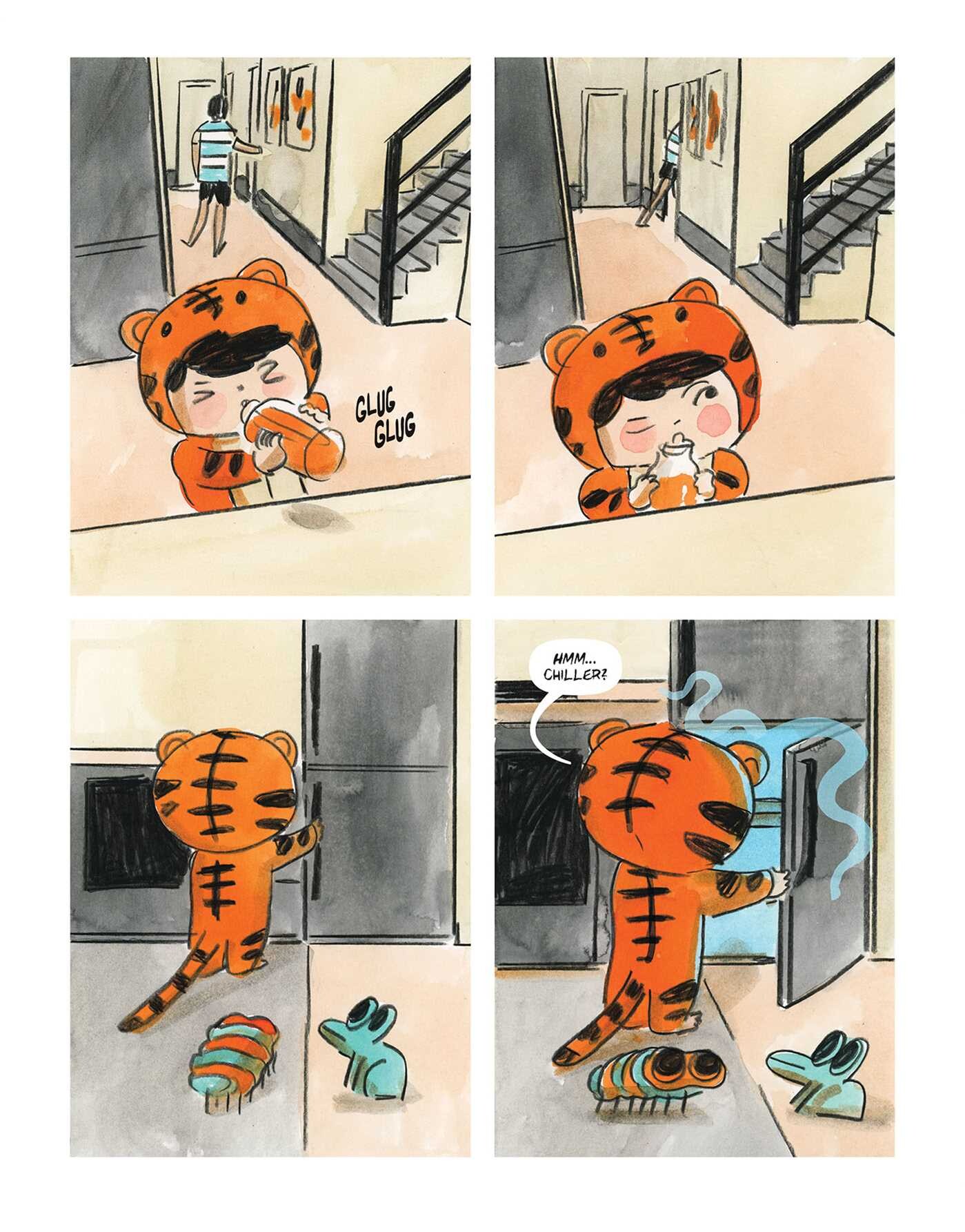 The summer temperature is really high, and young Mika is extremely hot, so her father opens the fridge door to generate some cool air in the room. His first mistake is not instead suggesting Mika remove her tiger suit onesie, his second is showing her the process, and his third is leaving the room. It’s not long before she’s discovered the fridge is above the freezer, and that’s even colder. What’s more both fridge and freezer contain some delightful looking objects, and Mika’s father is out of sight and out of mind.