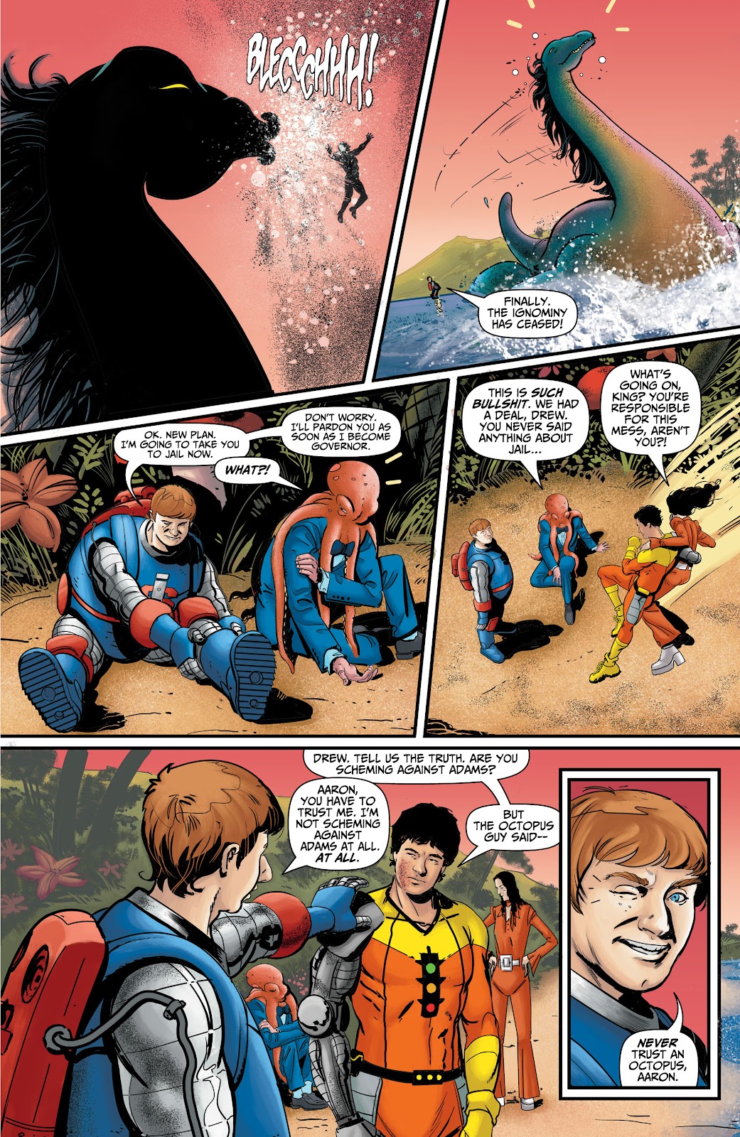Following the events of Thirty Minutes or Dead, Emperor King has reformed. Allegedly. To that end he’s accompanying his friend President John Adams, who’s been appointed Governor of the Peculiar Islands. Alongside both is Rush Hour, the somewhat confused traffic superhero wanting to ensure Emperor King really has reformed. Meanwhile Jamington Winthrop has been outed as superhero the Chandelier, but has had to hand over the intellectual property rights for his superhero identity to the IRS to pay a tax debt. The Chandelier is now being used to shill all kinds of products, but Winthrop finds a new career as a controversy podcaster – “I’m not saying every cow is fake, maybe just one out of every four”. And in Ohio perhaps it’s time for Captain Ohio to step up from Regional Hero to National Hero.