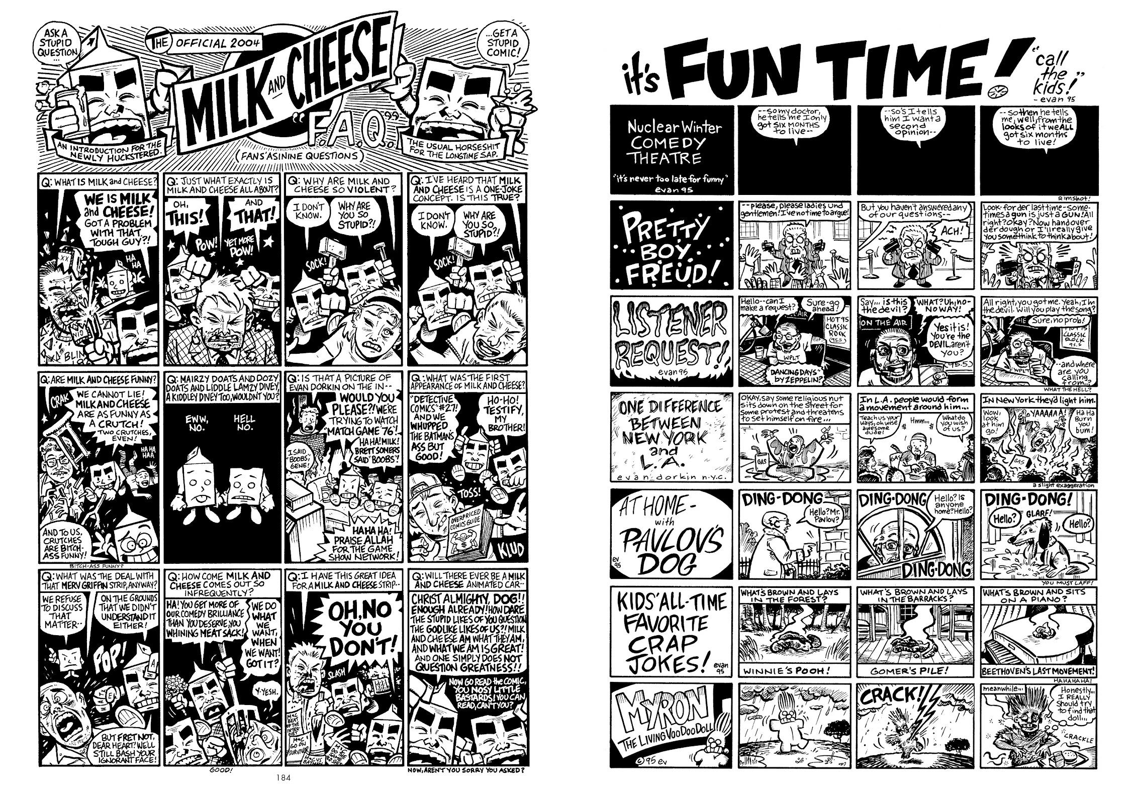 Dorkin’s still finding his artistic style on some of the early, looser Milk & Cheese strips, but it rapidly becomes neat, compact and precise, yet also imbued with a frenetic energy. That’s best seen in the exploits of the Eltingville Club, possessing the certainty of youth that their niche interests are unrecognised masterpieces. The bleakness that occasionally manifests in other strips reaches full fruition here, yet it’s simultaneously hilarious in the manner of someone else being poked in the eye with a finger.