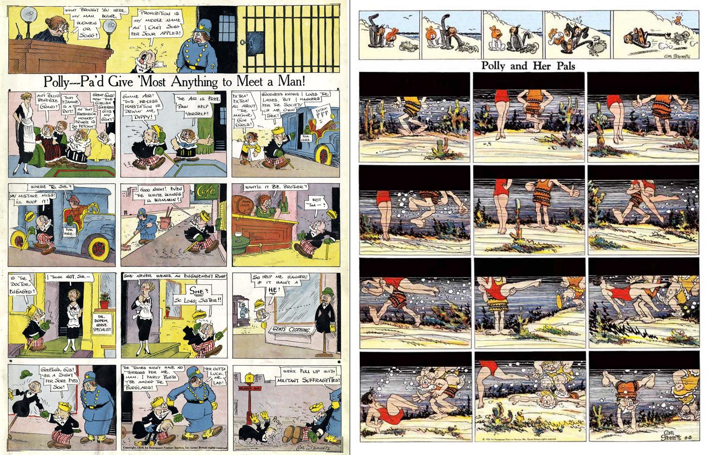 Cliff Sterrett doesn’t quite number among the earliest newspaper strip cartoonists, but a solo career begun in 1912 didn’t start long after. However, despite a dozen years of accomplished cartooning before a rapid developmental curve leading to a period of still remarkable Sunday pages, Sterrett remains a name known primarily to enthusiasts. Polly and Her Pals eludes the national consciousness aware of Krazy Kat, Peanuts or Calvin & Hobbes.