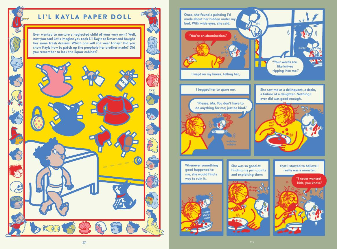 It’s the childhood experiences of author Kayla E., some of which she can’t recall, noting in one case games of gripping the soap in the bath while her father bathed her. She can remember the playful name of Soapy Dopey, but her mind only encounters a blackness when attempting to recall specifics. What she can recall is an absolutely horrific catalogue of systematic abuse with occasional extreme religious overtones. This is presented in consistently innovative ways, such as fifteen recollections of a grim home life as markers on a board game causing a player to move back several spaces. It’s an expansion of Chris Ware’s visual density, and events being related through the accessories of childhood means they’re not visually explicit, yet those trappings accentuate the vulnerability.