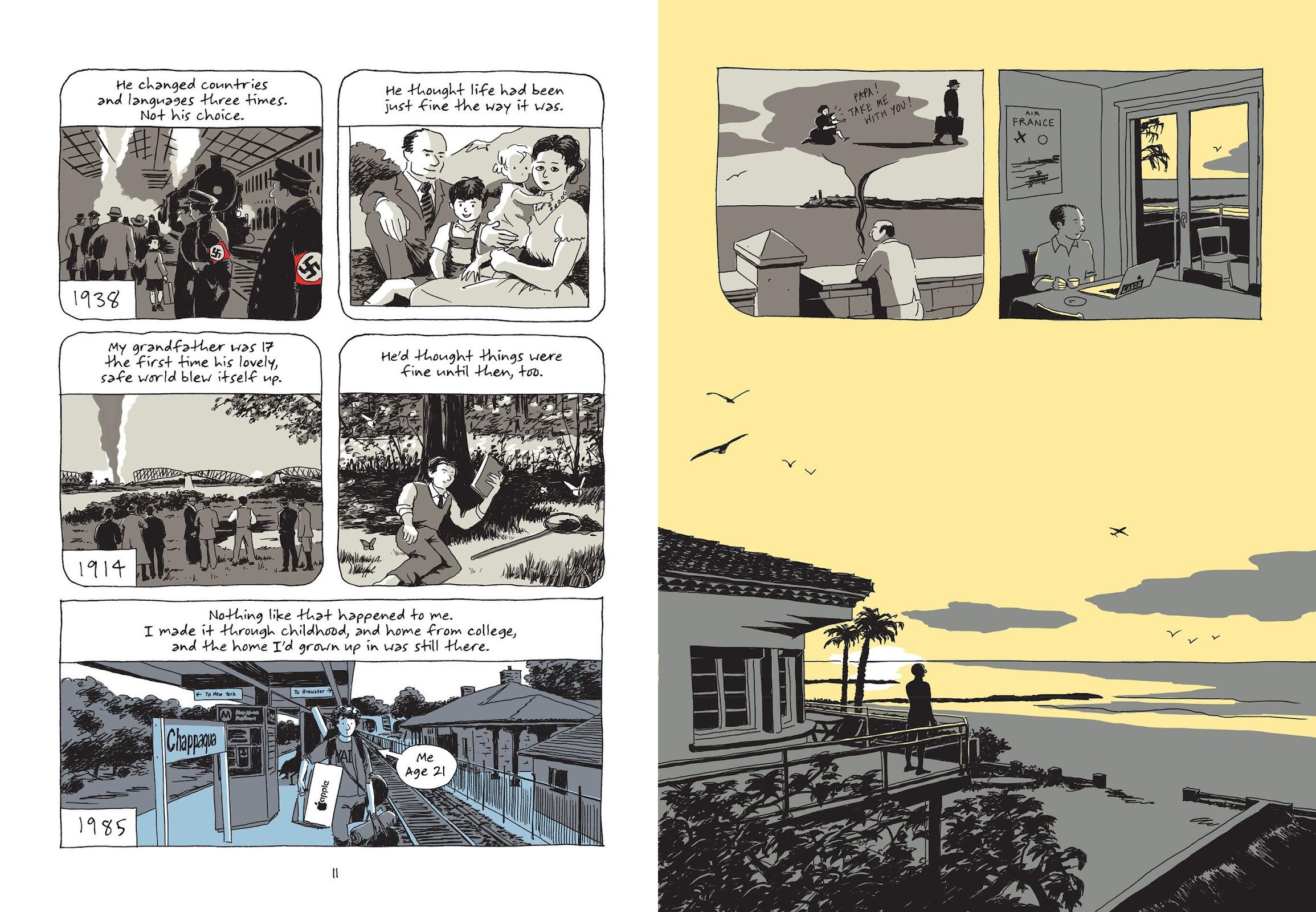 Jumping back and forth between decades is the storytelling method of choice, and the alternating time periods are separated by the simple method of being coloured differently. Red features for the Nazi era, pale yellow is the present, and blue Mechner’s childhood. It’s surprising how effective that is in creating memorable images such as the sunset on the sample art. Mechner details the painstaking process for his early game art, but Replay prioritises simplicity, loose figures and backgrounds yet also with attention to detail, such as the end of World War I being represented by the later infamous Compiègne Forest railway carriages.