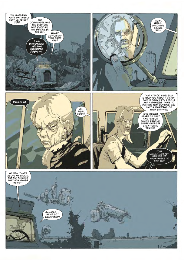That’s shown extremely well by Joe Currie, who’s one hell of artistic discovery. His pages are to drool over already, and imagining how he’ll develop is mindboggling. There’s barely a weakness. It’s frequently the case that an artist who loves the technological detail is perhaps not as efficient when it comes to movement, but that doesn’t affect Currie, who also has a delicately thin line, while his storytelling is clear and the designs phenomenal. His people are stylised, but they’re consistent throughout, and a nice touch is how the appearance of the Baroness changes according to circumstances.