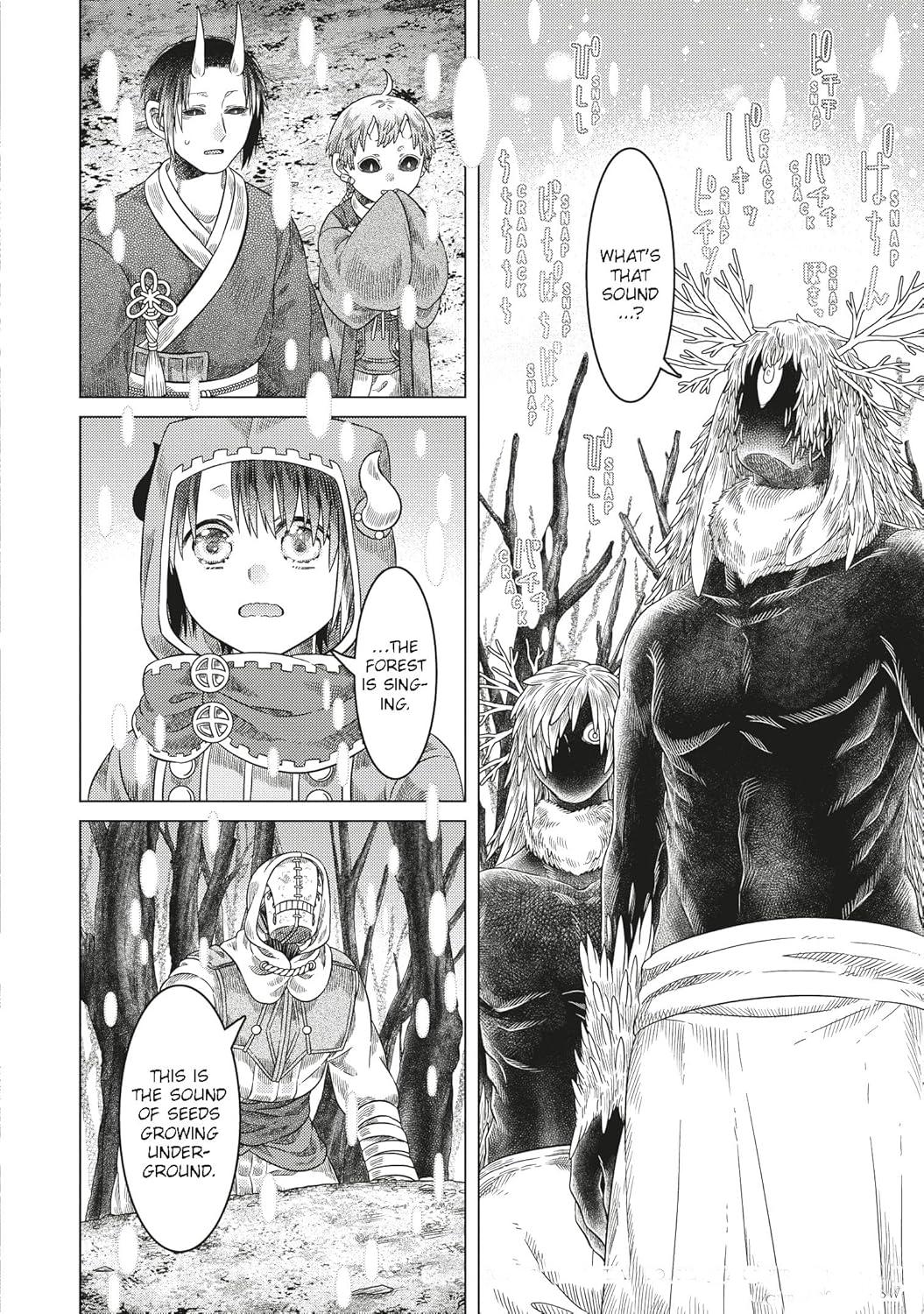 Somali continues to be an innocent accompanied by a what’s seen by some as a Forest Spirit, but who is seen by others as a golem to be feared. Also feared are humans, who’re hunted down. Along their wanderings they’ve been joined by Uzoi and Haitora, and Vol. 3 ended with a shocking revelation about them.
