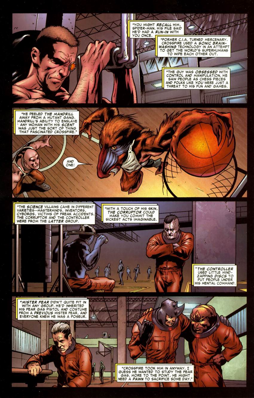 It’s not Bendis writing, though, but Tony Bedard, who begins by setting up a grudge between the U-Foes and Crossfire, making it seem he framed them, and continues to focus on the villains, Before escaping Crossfire gathered some allies, each of them able to control people in some fashion. Spider-Man, though, manages to transform that strength into a weakness as they miss him and target each other. It’s far from the only clever element in a plot that twists, turns and positively slides away from expectation, each new revelation opening another box. Along the way Bedard bolsters the characters and backstories of the villains, supplies Spider-Man with some difficult choices and features several guest stars. An early scene of Captain America and Iron Man explaining the opportunities open to Spider-Man as an Avenger is especially well conceived.