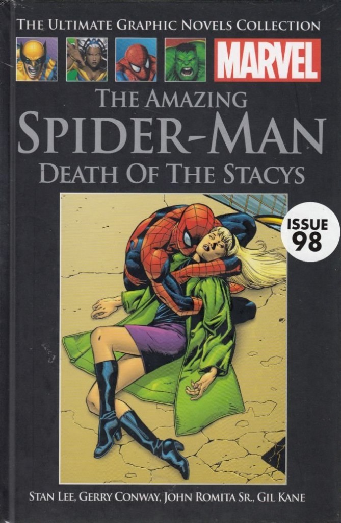 The Gwen Stacy story can be found in black and white on pulp paper in Essential Amazing Spider-Man volume six, and also in Spider-Man: The Death of Gwen Stacy, the 13th volume of Marvel Masterworks: Amazing Spider-Man, and in the UK as the pocket-sized The Night Gwen Stacy Died. The earlier material is in the tenth Marvel Masterworks volume of Amazing Spider-Man and Essential Amazing Spider-Man volume five. In the UK this collection can also be found among the material collected for Hachette’s partwork Ultimate Graphic Novels Collection.