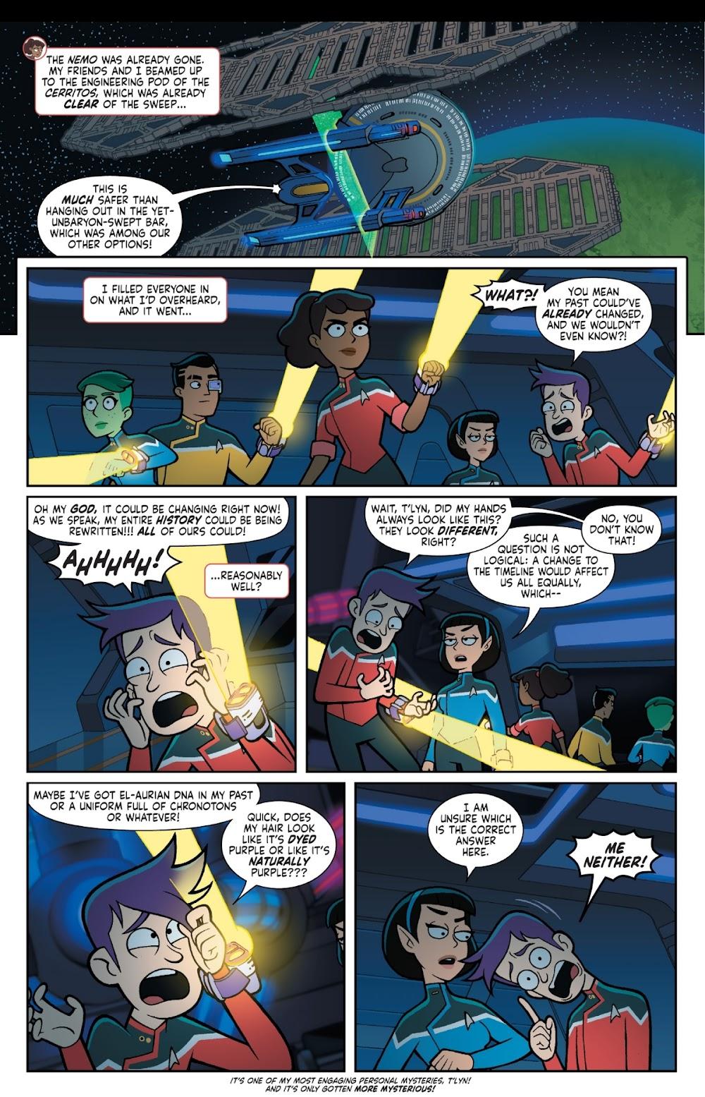 Jack Lawrence draws the opening two-parter and Derek Charm (sample art) the remaining four chapters. As has been pointed out elsewhere, as this is based on an animated series, the artists have their visual reference, and there’s none of the awkwardness of an artist being able to draw a really good likeness of Sonequa Martin-Green, but not as capable when it comes to Anthony Rapp. Both artists give you the characters you see on screen, and their cartooning is adaptable enough to design the weirdness North supplies.