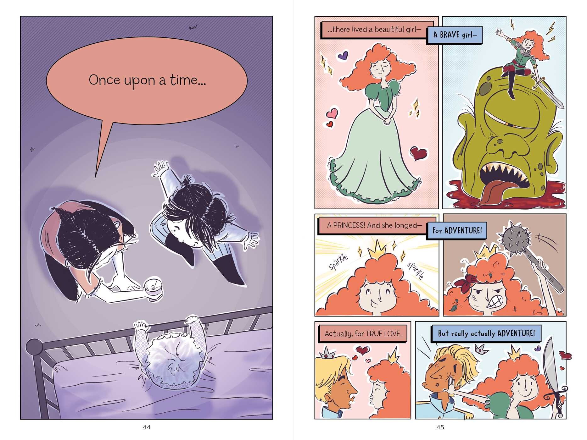 Beginning with an explanatory framing sequence highlighting the difficulties of sisters getting on, Cassandra Federman switches from purple-toned pages to full colour for the story told. As shown by the sample art, Kennedy and Devon, who’s almost five years younger, have very different ideas as to what constitutes a good story, and Federman cleverly changes to a rougher style of art to show Devon’s contributions. It’s an immediately appealing procedure, with Devon sabotaging Kennedy’s attempts to tell a romantic story, which leads to the circumstances supplied by the subtitle of A Sisterly Tale of Danger, a Princess and her Crew of Lady Pirates.