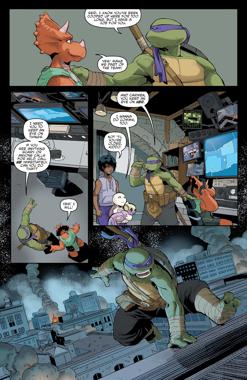 A key moment in The Armageddon Game is the Turtles allegedly attacking New York’s corrupt Mayor Stockman, where for a while it’s rather the mystery. Here Sophie Campbell chooses to show the main players recognising a false flag mission, but the results in Mutant Town are deadly, sparking a riot, and the consequences of that play out. It’s combined with a plot about the Utrom wanting the death of Sera, currently protected by the Turtles in their lair.
