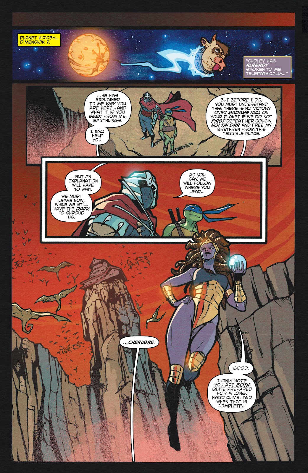 We begin here with the Turtles aware the Rat King’s up to something apocalyptic, but not sure what it is. It’s decided the best way of foiling the plan is to target the Rat King’s allies, and to this end Leonardo and Michelangelo accompany Oraku Saki to Dimension X to unite the enemies of General Krang, while Raphael and Jennika attempt to locate Old Hob, whom Stockman fears.