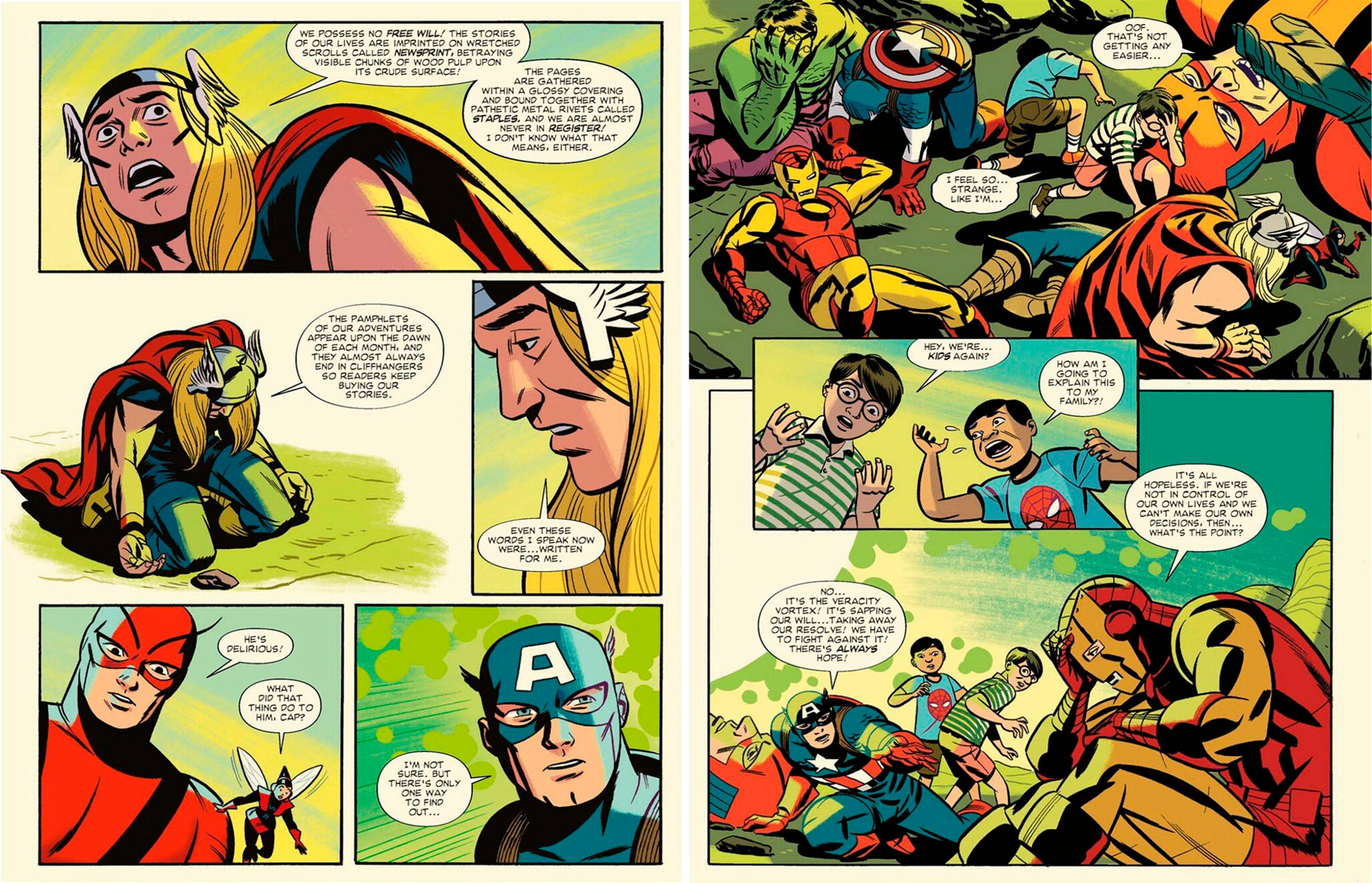 Kidd’s efforts to achieve a 1960s lightness of tone deliver a book written at the level of an eight-year-old child, punctuated by self indulgent, grown-up in-jokes they won’t understand. Cho’s beautifully retro Kirby-style heroes are pristine and weightless, the story giving them little to do beyond routine fights, broad smiles and generic quips. The fourth-wall-busting plotline spun out of Loki’s ‘evil secret’ is a narrative device that Lee and Kirby used to great and funny effect in several Marvel stories, but rather than one incidental moment in an adventure, here it’s the big concept powering everything. This has the unfortunate effect of turning the Avengers into sockpuppets being moved through an arbitrary set of actions centred around the two authors instead, as we watch Kidd and Cho working through their feelings, to solve their contrived problem with a literal deus ex machina.