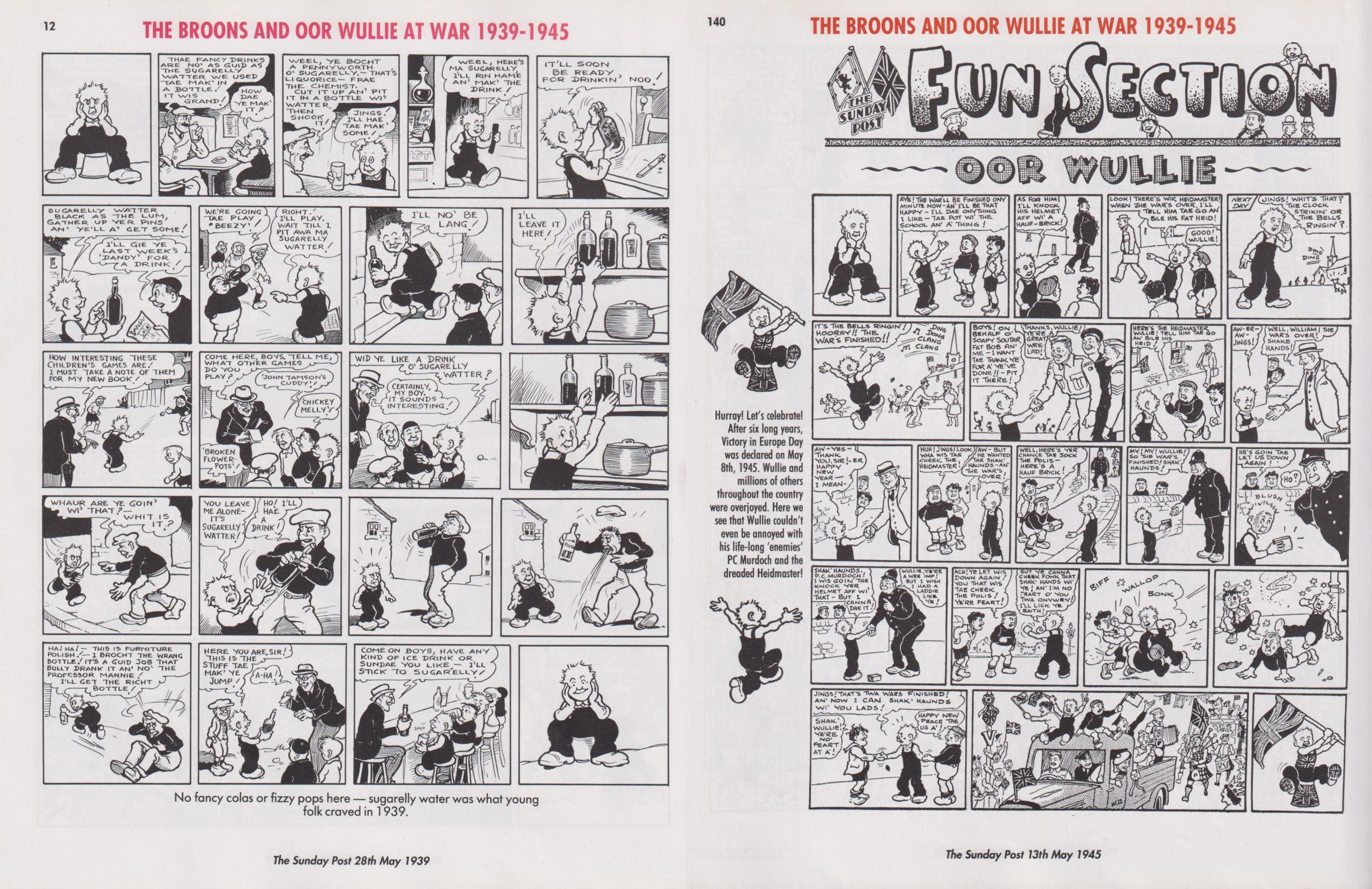 It’s felt some of the historical references are now too obscure, and so in addition to the year by year text pages a few strips feature additional explanations, but definitely not enough. It’s unlikely anyone under the age of fifty will understand a Wullie strip about the V sign. Spot the rare strip where Wullie’s not sitting on his bucket at the end, and how many plugs there are for DC Thomson comics The Beano and The Dandy.