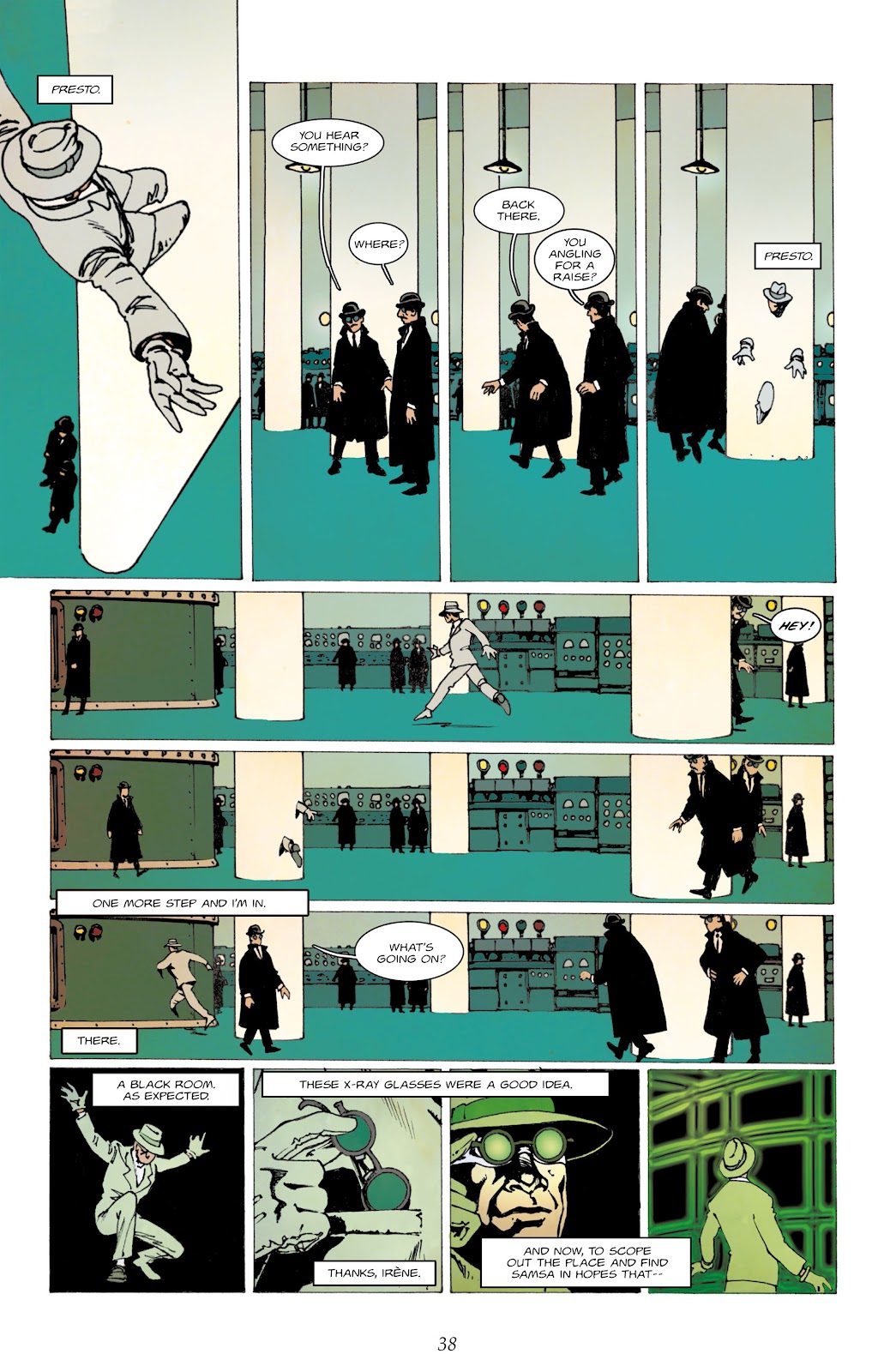 Over two chapters artist Gess (Stéphane Girard) has to create two very different environments and a broad selection of people, some of whose larger roles don’t occur in this opening volume. Unlike other artists taking on a large cast, he opts not for big panels, but small ones, enclosing people within their environment. The sample art seems to be a homage to both Fantomas and the Spirit, a character able to walk through walls stylishly presented on a rescue mission. Gess suggests the period subtly through decorations and retro-styled technology more than anything else.